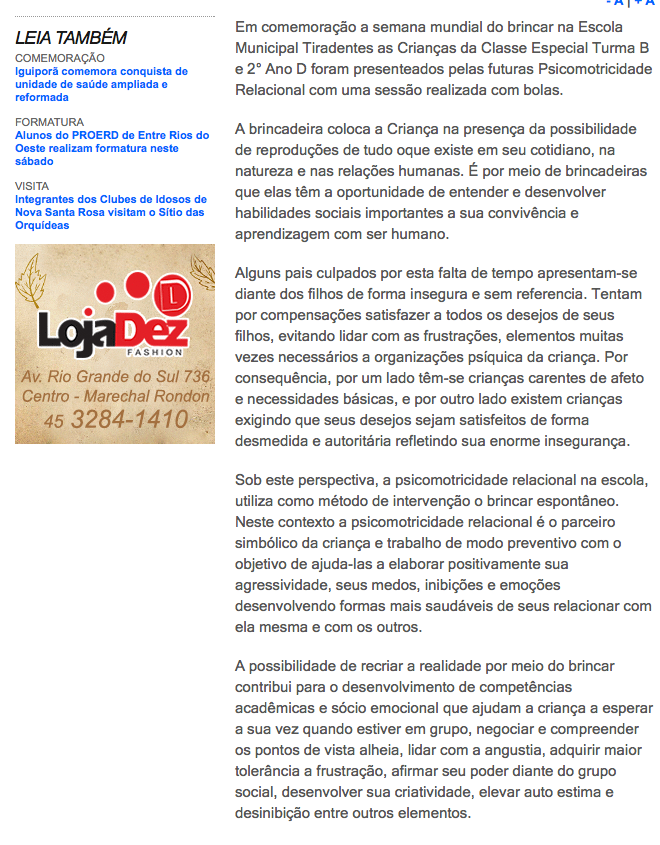 Semana Mundial do Brincar é realizada com alunos da Escola Municipal Tiradentes